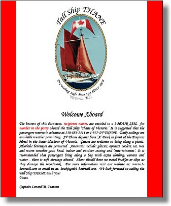 7) Gift Certificates may be redeemed for goods and services only and cannot be redeemed for cash. Any questions regarding your order should be addressed to Sue Powers at threehoursail@yahoo.ca or 1-877-788-4263 |