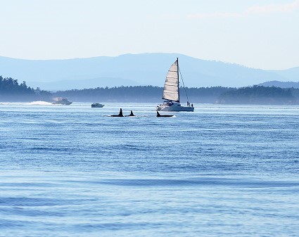 (Photo courtesy Linda Rose) They are currently on the endangered species list. Unlike the opportunistic transient killer whales, the Southern residents feed largely on salmon. They are stressed by a lack of food due to over fishing, development and deforestation. They hunt by eco-location and for this reason scientists are now suggesting that boat traffic and noise could be adding to their stress. Compounding their problems, they are so high in PCB's that they are treated as toxic waste when they die. With weakened immune systems, many of the breeding age are dying as well as the newborns. Despite their endangered status and all the scientific evidence suggesting boat traffic could be stressing them; the Southern Residents remain the most observed whales in the world.